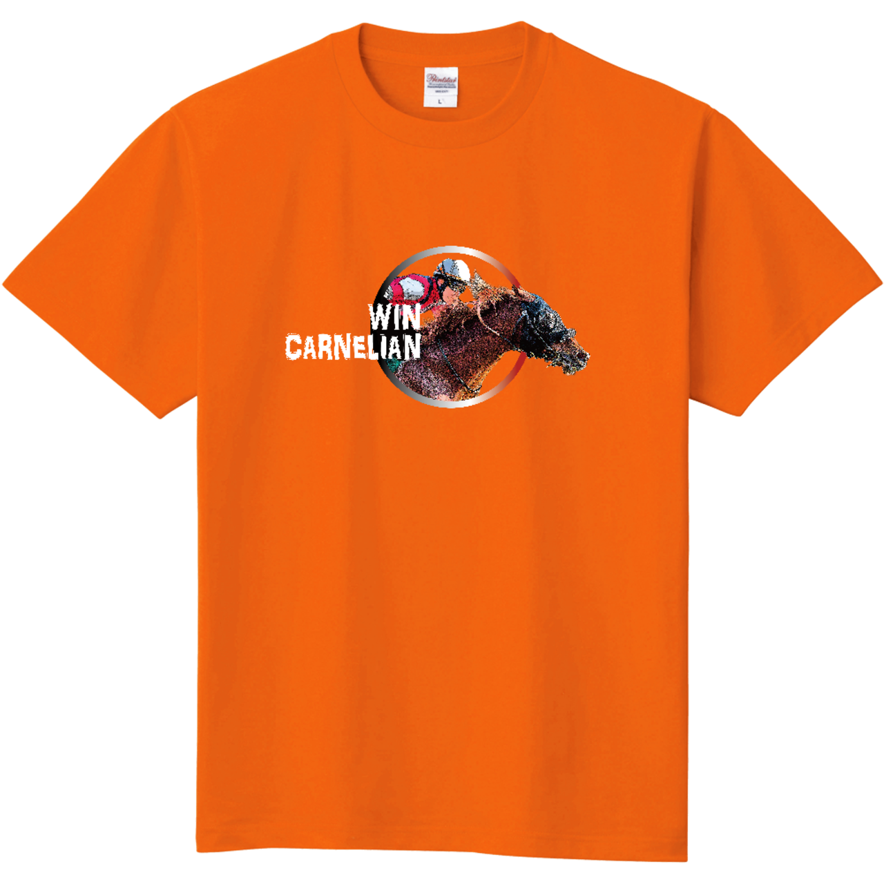 Tシャツの色は、馬名の由来である宝石のカーネリアンの色をイメージしました。
